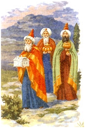 Когда же Иисус родился в Вифлееме Иудейском во дни царя Ирода, пришли в Иерусалим волхвы с востока и говорят: где родившийся царь Иудейский? Ибо мы видели звезду Его на востоке и пришил поклониться Ему. И, се звезда, которую видели они на востоке, шла перед ними, как наконец пришла и остановилась над местом, где был Младенец. Увидев же звезду, они возрадовались радостью весьма великою, и, войдя, увидели Младенца с Мариею, Матерью Его, и, пав, поклонились Ему; и, открыв сокровища свои, принесли Ему дары: золото, ладан и смирну.