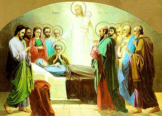 По Божиему промыслу Апостол Фома не присутствовал при погребении Богородицы. Он пришел в Иерусалим по прошествии двух дней на третий и стал плакать возле гроба. Апостолы сжалились над ним и отвалили камень от гроба, чтобы Апостол Фома мог приложиться к святому телу Приснодевы. Но тело Ее исчезло, и в пещере лежали только погребальные пелены. Пречистая Богородица была взята на небо в теле. Вечером того же дня за трапезой им явилась Матерь Божия и произнесла: «Радуйтесь! Я с Вами во все дни». В ответ Апостолы воскликнули при преломлении хлеба: «Пресвятая Богородица, помогай нам».