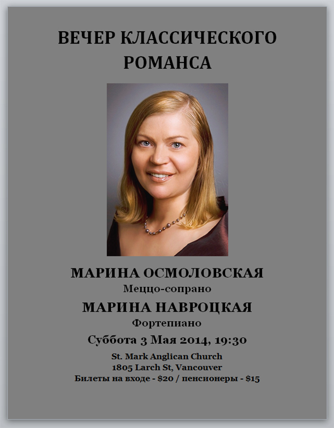 Исполнители Марина Осмоловская (меццо-сопрано) и Марина Навроцкая (фортепиано) хорошо знакомы и давно любимы ванкуверской публикой.